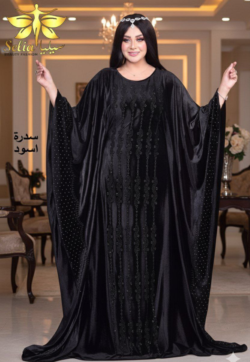 الاكمام بالطول ولأسفل العباية عليها ستراس كثيف كما هو موضح بالصور والفيديوهات